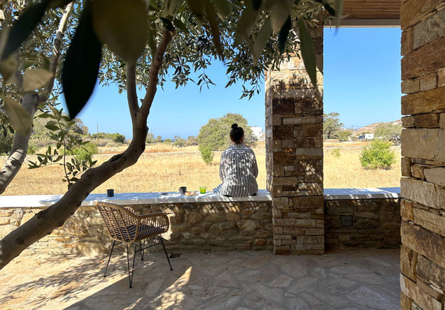 Step inside and feel at home. The spacious layout is designed for easy, relaxed living – perfect for couples, friends, or families. The open-plan kitchen and dining area invite long, shared meals or quiet mornings with coffee. Whether you’re cooking something simple or just enjoying the space, it’s easy to unwind and connect. From every room, large glass doors open directly onto the terrace, flooding the space with natural light and offering a seamless flow between indoors and outdoors. The connection to the landscape is always present – the mountains feel close, and the calm is immediate. Outside, the terrace is your private sanctuary, surrounded with the charm of olive groves. Enjoy dinner under the stars at the outdoor dining table or sink into the cozy lounge seating for a glass of wine as the day fades. As the sun begins to set, the soft sound of goat bells drifting through the air adds a touch of rustic charm to the evening, echoing from the hills as the animals return home. Although you’re tucked away in peaceful surroundings, it’s just a short 4-minute walk down to the beach, where a wide range of restaurants and bars await. This quiet corner of Ios offers the perfect balance: a calm, restful place to return to – yet close enough to the vibrant seaside to enjoy everything the island has to offer.